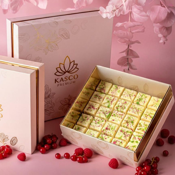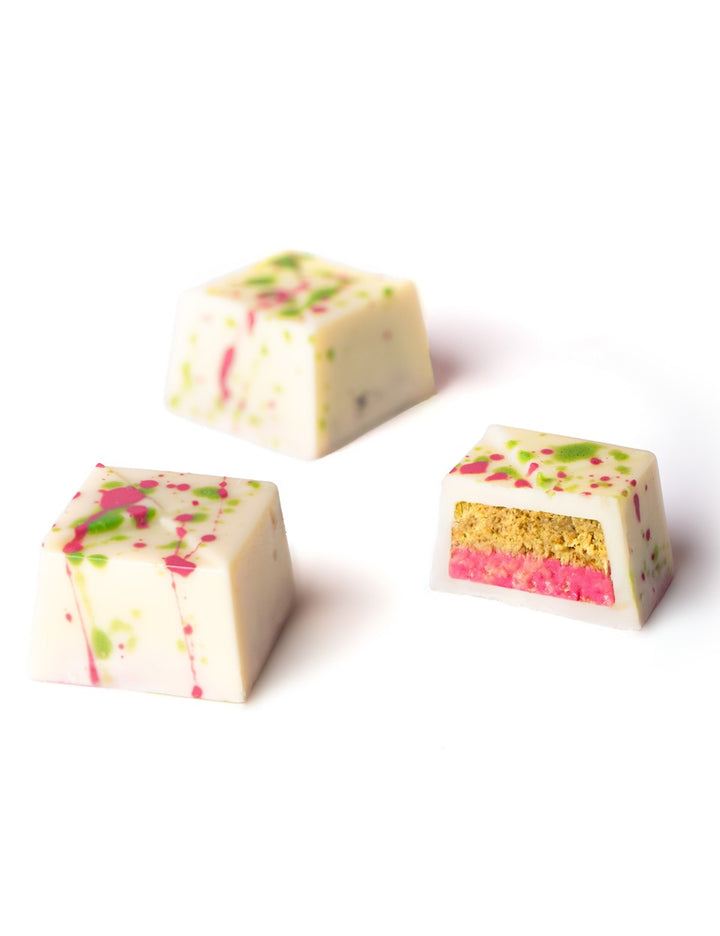 Red fruity filling with another crunchy kunafa pistachio chocolate.